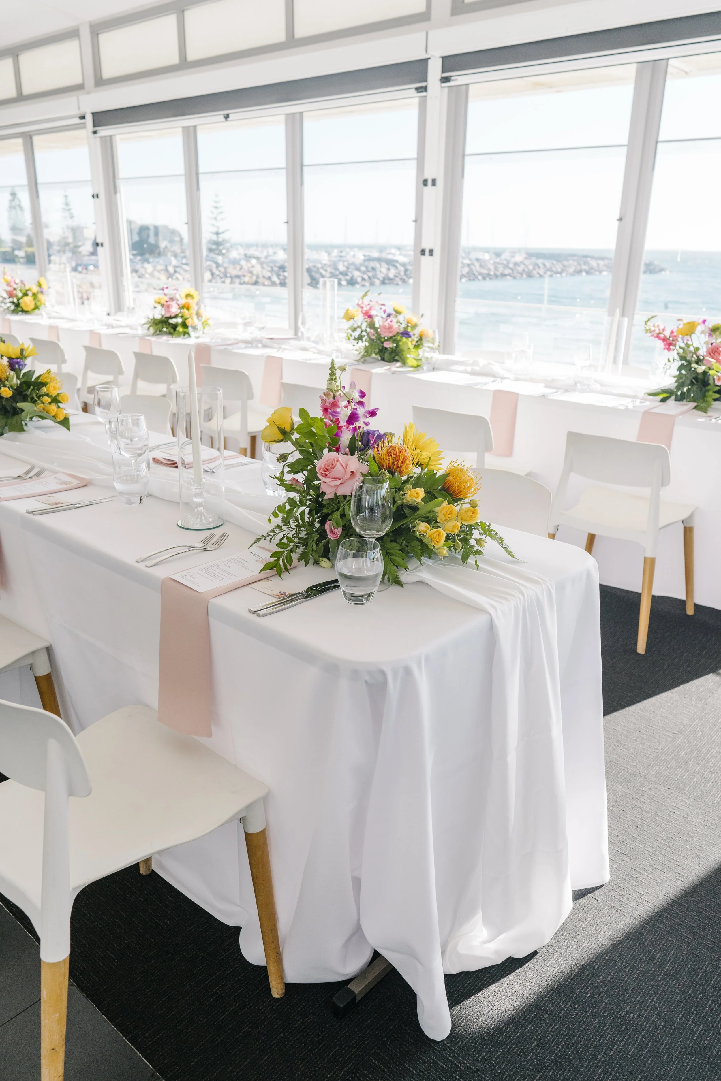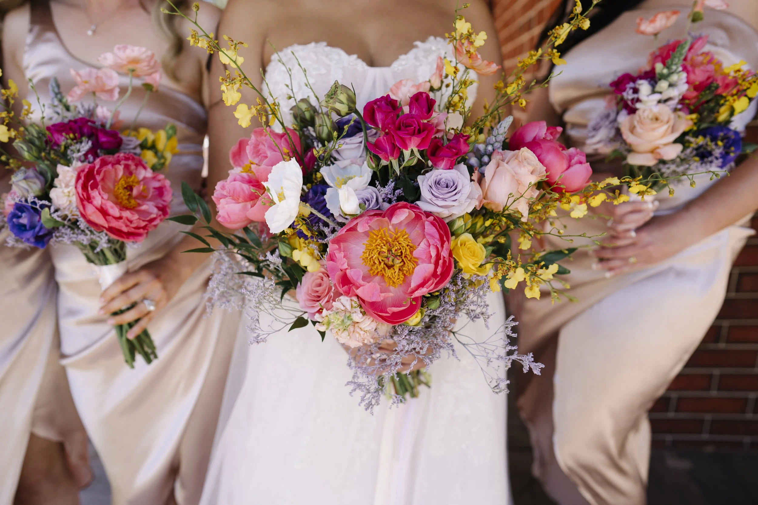 Jazz chose a colorful mix of bright blooms that had meaning to their relationship. we reused the ceremony blooms on the bridal table at the reception.