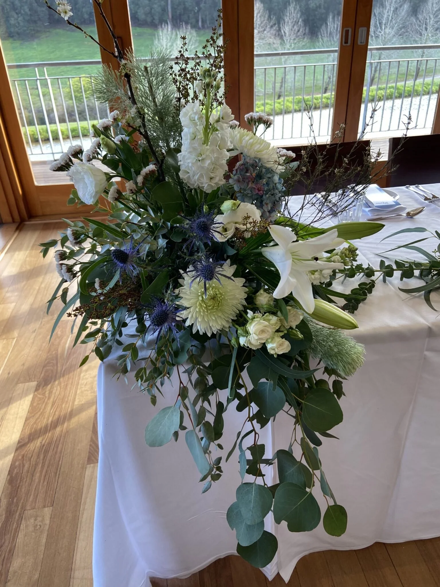 We reused all the ceremony flowers in the reception. The arbor flowers went behind the bridal table and the barrel flowers on the ends of the bridal table.