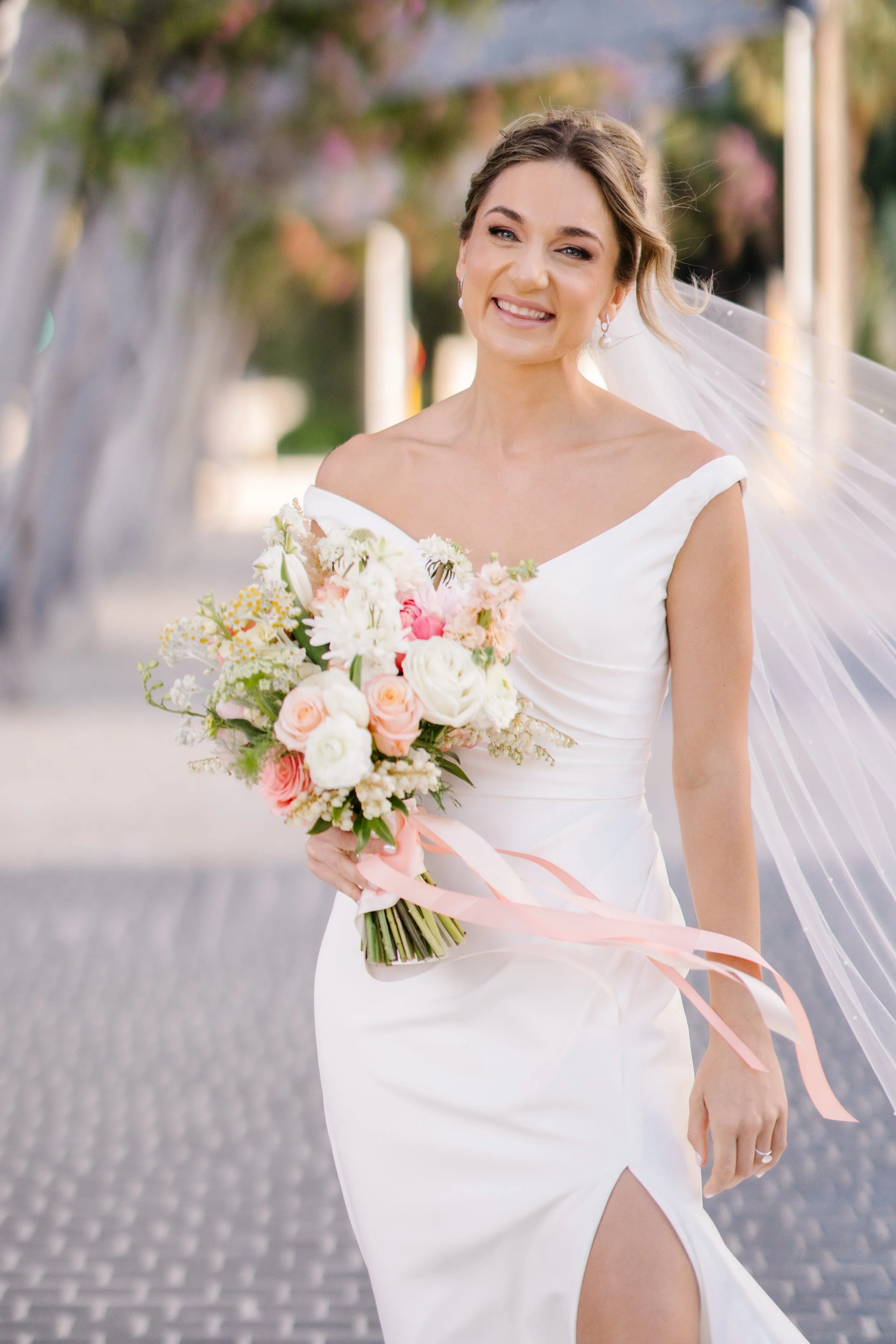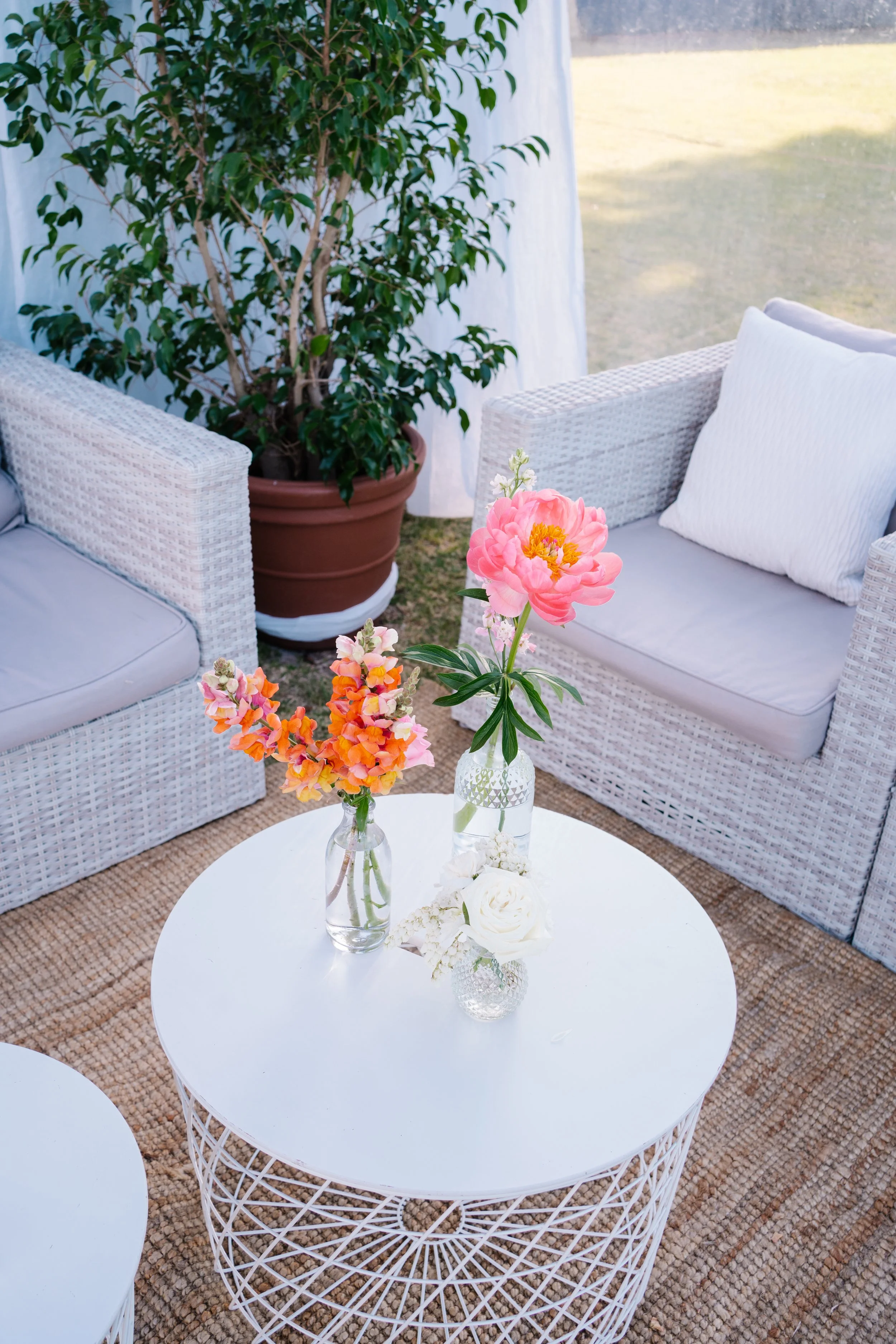 My brief for flowers was colouful with peach white, pink with pops of lilac and yellow .