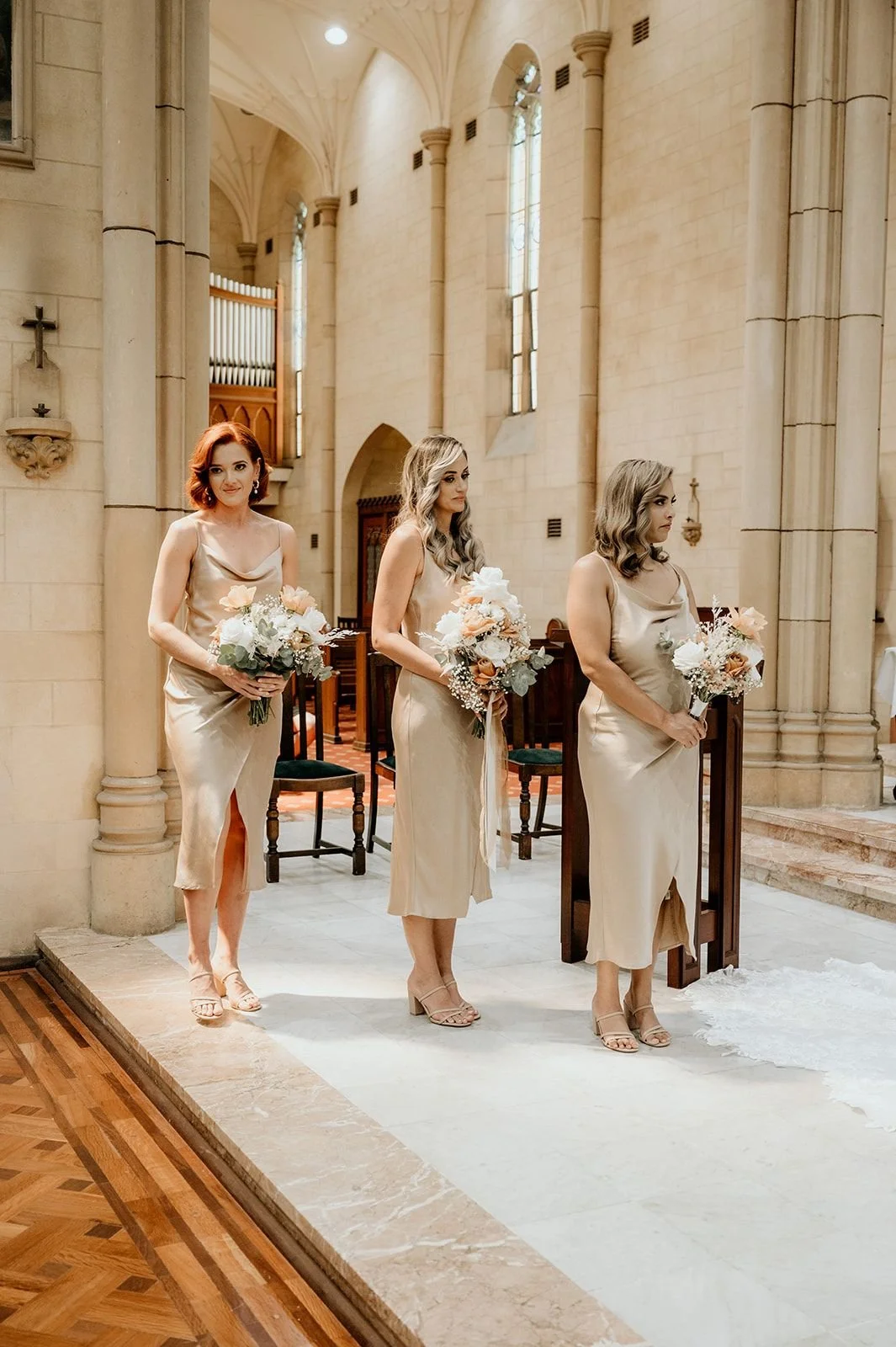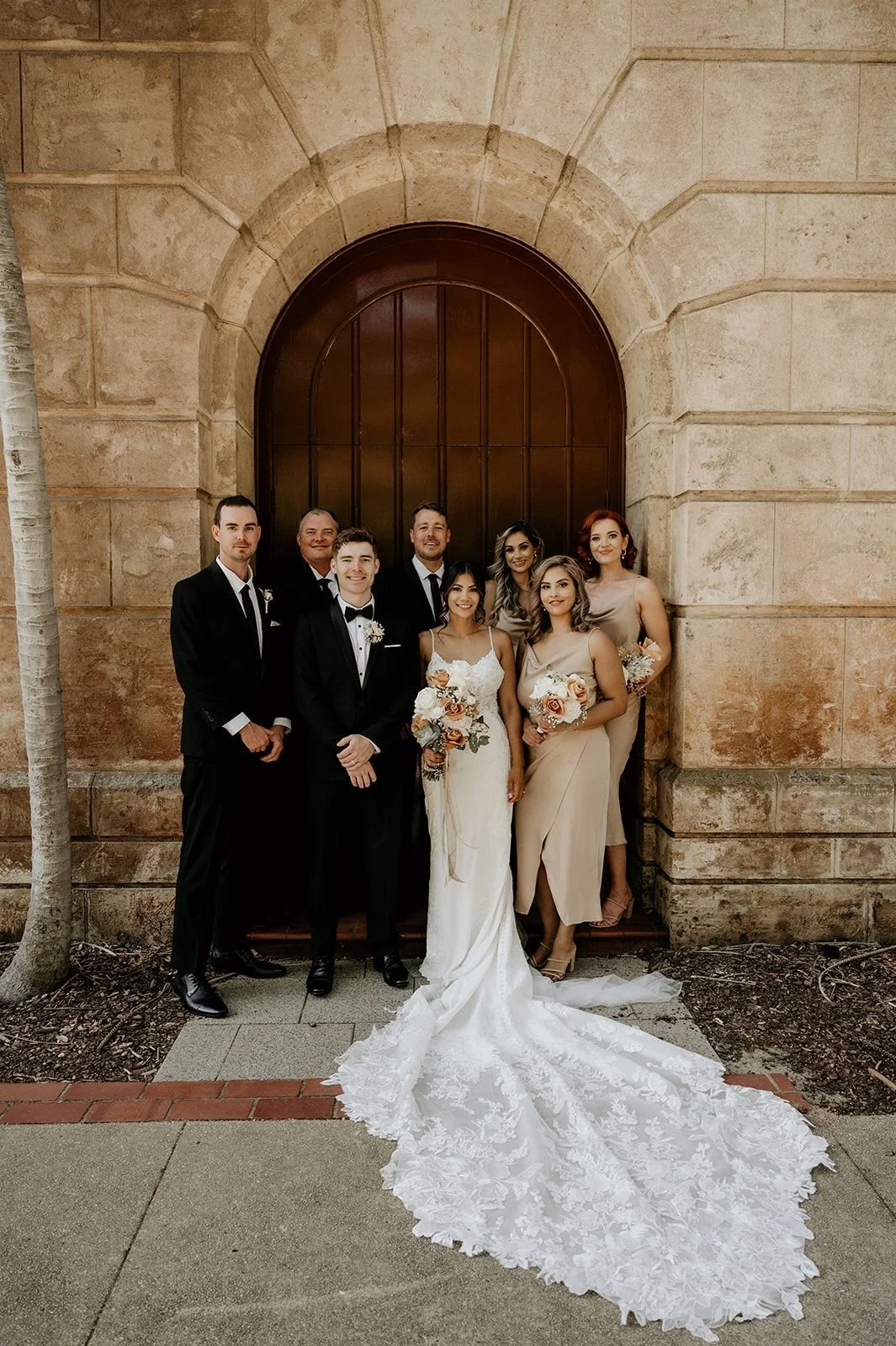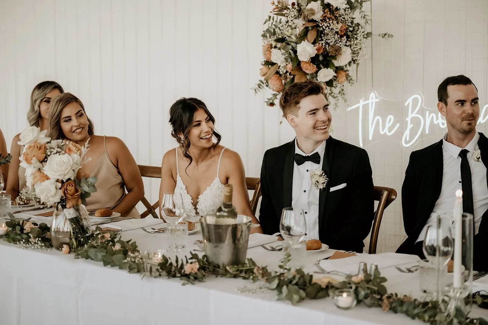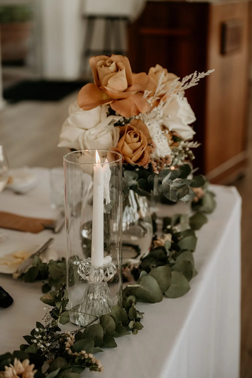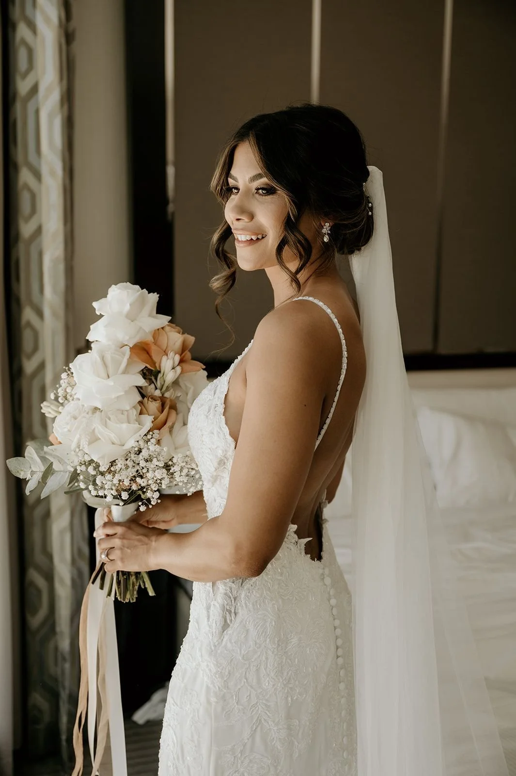 Rae chose warm Toffee Roses and seasonal blooms for her flowers and a modern style.